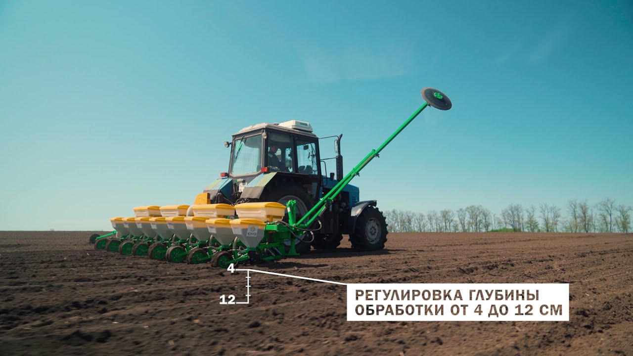 ▶ МС-8 пневматические сеялки, предназначенные для точного пунктирного, пунктирно-гнездового посева подсолнечника, кукурузы, сои, овощных культур, хлопчатника, сорго и бахчевых культур с одновременным, при этом раздельным от семян, внесением в почву минеральных удобрений. ,